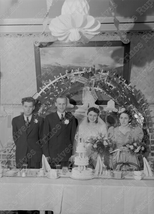 Scope & Content: Item consists of the Clausen wedding reception at the Commodore Cafe in 1936. Pictured from left to right is: Jack Campbell, Elmer Clausen, Eileen Clausen (nee Mair) and an unidentified woman standing behind the head table. Handwritten annotation on recto of copy 2 reads: "1. Jackie Campbell. 2. Elmer Clauson [sic]. 3. Mair. 4. Mr. & Mrs. Elmer Clauson's [sic] Wedding. Reception Commadore Cafe." Stamped annotation on verso of copy 2 reads: "Photo by Jack Wrathall Prince Rupert, B. C."
