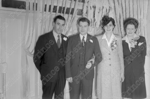 Scope & Content: Item consists of Bill and Rose McCallum (nee La Belle) standing in the centre holding hands with Carl Zarrelli and Mrs. Dick Long on either side of them on the McCallum's wedding day. Handwritten annotation on recto of copy 3 reads: "Carl Zarrelie [sic]. Rose La Belle. Mrs. Dick Long. Mr. & Mrs. Bill McCallum. Wedding 1948." Stamped annotation on verso of copy 3 reads: "Photo by Jack Wrathall Prince Rupert, B. C."