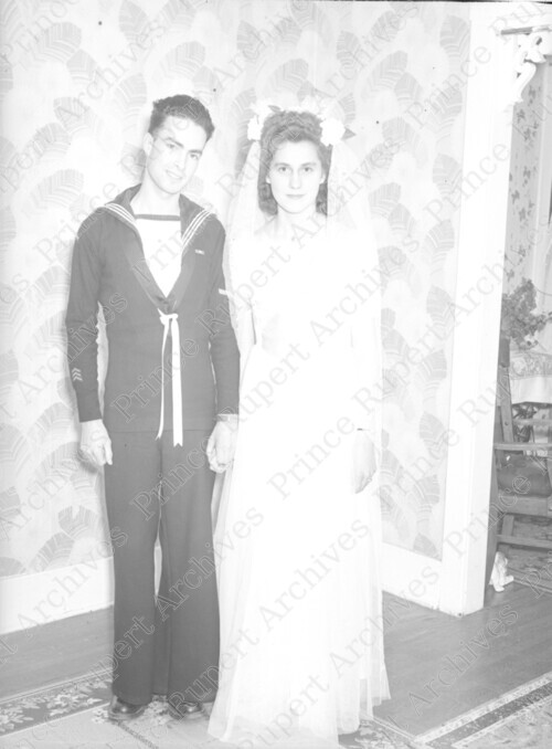 Scope & Content: Item consists of Mr. and Mrs. Jenson on their wedding day. Mr. Jenson is wearing a naval uniform and Mrs. Jenson is in a wedding gown. Handwritten annotation on recto of copy 2 reads: "Mr. & Mrs. Jenson Wedding. 1945." Stamped annotation on verso of copy 2 reads: "Photo by Jack Wrathall Prince Rupert, B. C."