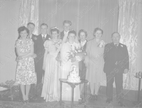 Scope & Content: Item consists of Dave and Faye Negrych standing with a group of guests behind a cake at their wedding. Pictured from left to right is Bea and Bill McChesney, Mr. and Mrs. Lloyd Stevens, Dave and Faye Negrych, Dot Fletcher and Faye Negrych's parents. Handwritten annotation recto of copy 2 reads: "1-2. Mr. & Mrs. Bea & Bill McChesney. 3-4. Mr & Mrs. Lloyd Stevens. 1945. 5-6. Mr. & Mrs. Dave Negrych. 7. Dot Fletcher. 8-9. Brides [sic] Mother & Father." Stamped annotation on verso of copy 2 reads: "Photo by Jack Wrathall Prince Rupert, B. C."