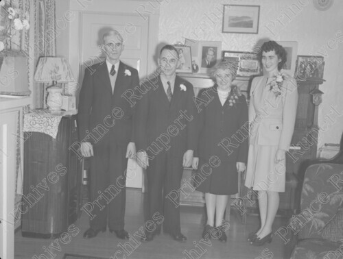 Scope & Content: Item consists of two men and two women standing together at the wedding of Molly Owens. The woman pictured farthest on the right is Pat Love. Handwritten annotation on recto of copy 2 reads: "Nov. 22 - 1946. 4. Pat Love. Mr. & Mrs." Stamped annotation on verso of copy 2 reads: "Photo by Jack Wrathall Prince Rupert, B. C."