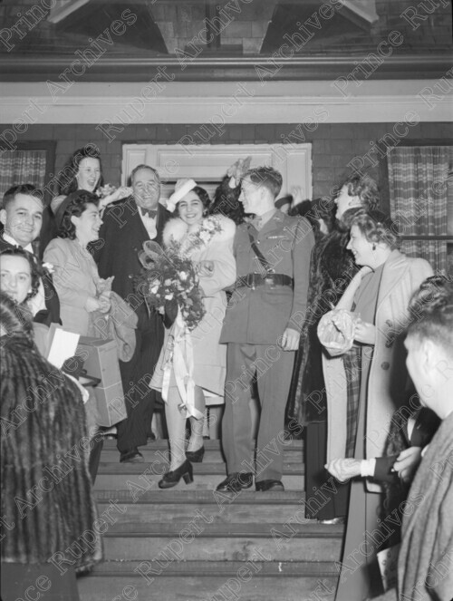 Scope & Content: A crowd looks on as Bob and Beatrice Winship (nee Berner) walk down the steps of a house on their wedding day in 1946. Al Berner can be seen standing on the left.