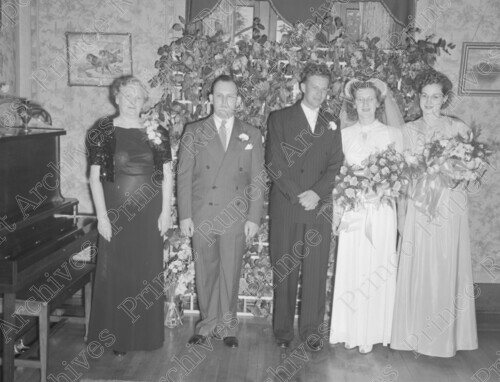 Scope & Content: Item consists of William and Alma Michalczuk (nee Dybhavn) standing with three wedding guests. Pictured from left to right is: Mrs. J Dybhavn, George Dybhavn, William Michalczuk, Alma Michalczuk (nee Dybhavn) and Helen Brown.