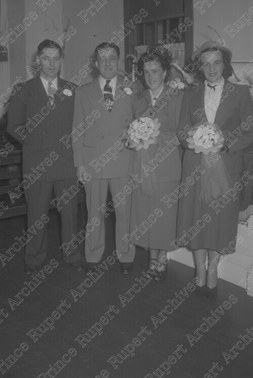 Scope & Content: Item consists of Tommy Mulhern, Frank and Rudy Comadina and Frank's sister Agnes Pierce standing in a row at the wedding of Rudy and Frank Comadina. Handwritten annotation on recto of copy 2 reads: "Tommy Mulhern. Prince Rupert. Agnes Pierce. Sister to Frank. Mr. & Mrs. Rudy & Frank Comadina Wedding. Sept. 2. 1947." Stamped annotation on verso of copy 2 reads: "Photo by Jack Wrathall Prince Rupert, B. C."