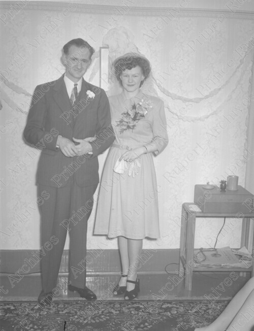 Scope & Content: Item consists of Bruce and Dot Stevens standing next to each other on their wedding day. Handwritten annotation on recto of copy 2 reads: "Mr. & Mrs. Bruce Stevens Wedding. Feb. 14 - 1947. Prince Rupert, B.C." Stamped annotation on verso of copy 2 reads: "Photo by Jack Wrathall Prince Rupert, B. C."