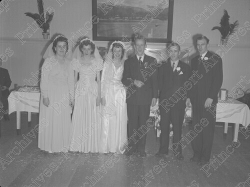 Scope & Content: Item consists of The wedding party for Don and Jean Nixon (nee Krause). Pictured from left to right is: Paulie Laporte (nee Krause), Thomasine Krause, Bride Jean Nixon (nee Krause), Groom Don Nixon, an unidentified man and Gus Krause. Handwritten annotation on recto of copy 2 reads: "Mr. & Mrs. Jean & Don Nixon Wedding. 1948." Stamped annotation on verso of copy 2 reads: "Photo by Jack Wrathall Prince Rupert, B. C."