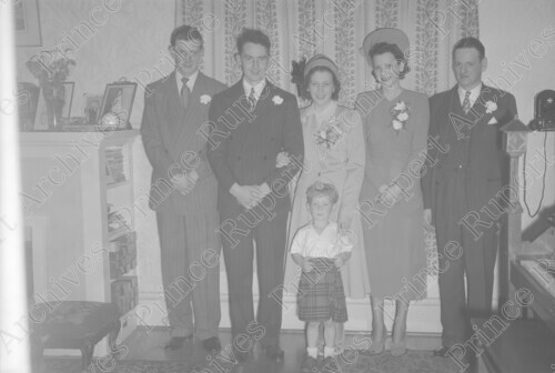 Scope & Content: Bruce and Palma Love with linked arms standing in the centre with a man, woman, child and Ken Nesbitt on the far right on the Loves wedding day. Handwritten annotation on recto of copy 2 reads: "5. Ken Nesbit [sic]. Mr. & Mrs. Bruce Love. Wedding. Oct. 2 - 1948." Stamped annotation on verso of copy 2 reads: "Photo by Jack Wrathall Prince Rupert, B. C."
