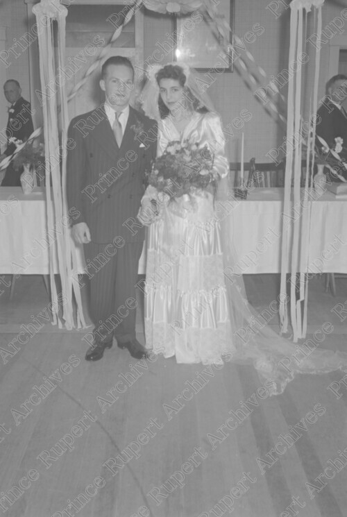 Scope & Content: Item consists of Glen and Muriel Smith standing next to each other showing decorations in the background on their wedding day. Handwritten annotation on recto of copy 2 reads: "Mr. & Mrs. Glen Smith. Wedding. Aug. 4. 1948." Stamped annotation on verso of copy 2 reads: "Photo by Jack Wrathall Prince Rupert, B. C."