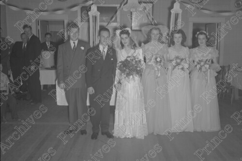 Scope & Content: Item consists of the wedding party for Glen and Muriel Smith. Pictured from left to right is: Ralph Smith, Groom Glen Smith, Bride Muriel Smith and three bridesmaids. Handwritten annotation on recto of copy 2 reads: " 1. Ralph Smith. Mr. & Mrs. Glen Smith. Wedding. Aug. 4 - 1948." Stamped annotation on verso of copy 2 reads: "Photo by Jack Wrathall Prince Rupert, B. C."