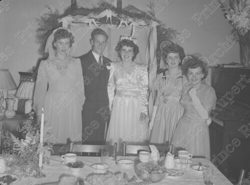Scope & Content: Item consists of Ray and Mavis Haugan (nee Thain) with the bridal party at their wedding in 1948. Pictured from left to right is: an unidentified woman, Groom Ray Haugan, Bride Mavis Haugan (nee Thain), Rusty Thain and Pat Davis. Handwritten annotation on recto of copy 2 reads: "Mr. & Mrs. Mavis & Hogan. Wedding. 1948." Stamped annotation on verso of copy 2 reads: "Photo by Jack Wrathall Prince Rupert, B. C."
