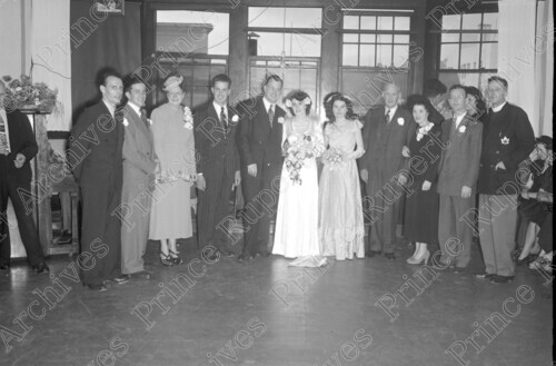 Scope & Content: Item consists of the Wedding party and guests at the wedding of Bill and Mary Long. Pictured from left to right is: Don Pitch, Al Phillipson, Mrs. Dick Long, Swede Morse, Bill Long, Mary Long, Eileen Sheppard, Dick Long, Louise Phillipson, Bud Timbeamister and Reverend Basie Proctor. Handwritten annotation on recto of copy 2 reads: "Mr. & Mrs. Bill Long's Wedding. Aug, 19 - 1949."