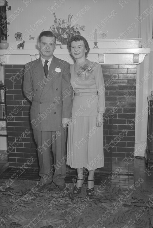 Scope & Content: Item consists of Bob Elkins and his wife posing for a photograph on their wedding day. Handwritten annotation on recto of copy 2 reads: "Mr. & Mrs. Bob Elkins Wedding. Feb - 1950." Stamped annotation on verso of copy 2 reads: "Photo by Jack Wrathall Prince Rupert, B. C."
