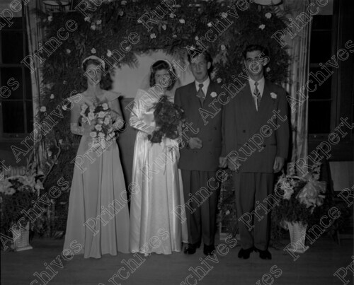 Scope & Content: Item consists of Eddie and Jean Dawes (nee Derry) standing in the middle with a bridesmaid to their right and Jack Eby to their left on their wedding day. Handwritten annotation on recto of copy 2 reads: "Jack Eby. Mr. & Mrs. Eddie Dawes Wedding. Aug. 1951." Stamped annotation on verso of copy 2 reads: "Photo by Jack Wrathall Prince Rupert, B. C."