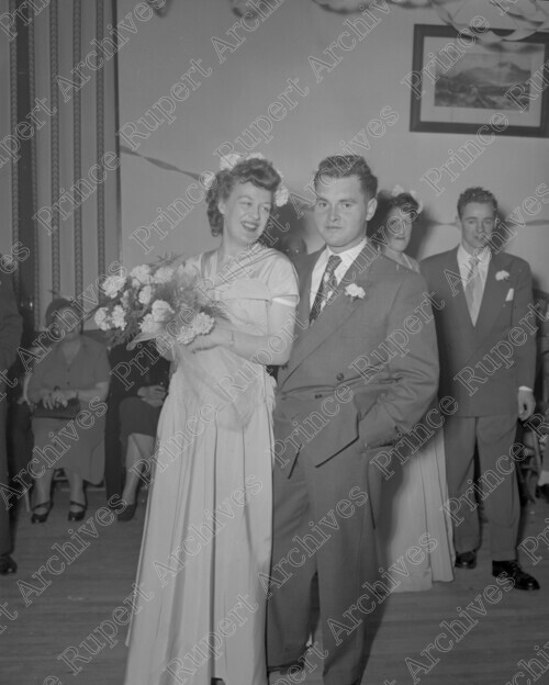 Scope & Content: Item consists of Jean Andreassen (nee Faught), holding a bouquet standing with Ernie Wallace showing Frances Hanson and Alfred Shrubsall in the background at the wedding of Phil and Marjorie Laporte. Handwritten annotation on recto of copy 2 reads: "At Nov. 1951." Handwritten annotation on verso of copy 2 reads: "Laporte. Photo by Jack Wrathall Prince Rupert, B. C."