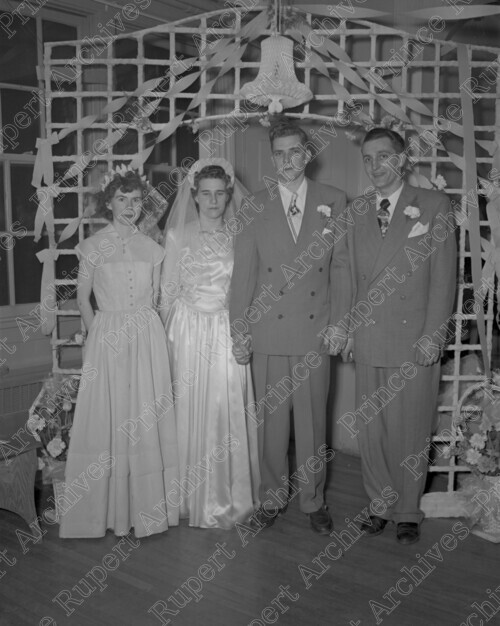 Scope & Content: Item consists of Irma Bishop, Dorothy Haudenschild (nee Basarabas) (Bride), Robert Haudenschild (groom) and Gordon Rothwell standing in a row on the wedding day of Dorothy and Robert Haudenschild. Handwritten annotation on recto of copy 2 reads: "Mr. & Mrs Haudenschild. Wedding. Mar. 22. 1952." Stamped annotation on verso of copy 2 reads: "Photo by Jack Wrathall Prince Rupert, B. C."