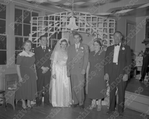 Scope & Content: Item consists of Robert and Dorothy Haudenschild standing with a group of guests at their wedding. Pictured from left to right is: a woman, a man, Dorothy Haudenschild (nee Basarabas), Robert Haudenschild, Mrs. Samuel Haudenschild and Samuel Haudenschild. Handwritten annotation on recto of copy 2 reads: "Mr. & Mrs. Sam Haudenschild. Mr. & Mrs. Haudenschild. Wedding. Mar. 22 - 1952." Stamped annotation on verso of copy 2 reads: "Photo by Jack Wrathall Prince Rupert, B. C."