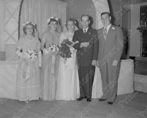 Scope & Content: Item consists of the wedding party of Evelyn McNab and Don True standing in a row. From left to right; two women, Evelyn McNab, Don True and Dave McNab. Handwritten annotation on recto of copy 2 reads: "1. 2. 3. Evelyn McNab. 4. Don True. 5. Dave McNab. Mr. & Mrs. Don True. Wedding. Oct. 22. 1952." Stamped annotation on verso of copy 2 reads: "Photo by Jack Wrathall Prince Rupert, B. C."