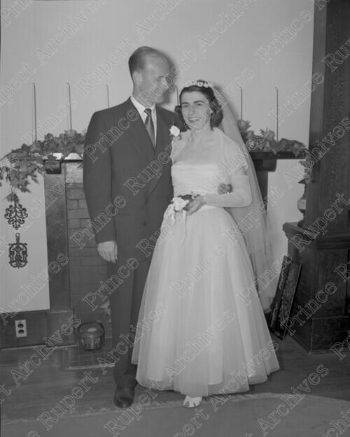 Scope & Content: Item consists of Wilf Whitehouse and Dellie Balagno posing for a photograph on their wedding day. Handwritten annotation on recto of copy 2 reads: "Dellie Balagno. Mr. & Mrs Wilf Whitehouse. Wedding. 1952." Stamped annotation on verso of copy 2 reads: "Photo by Jack Wrathall Prince Rupert, B. C."