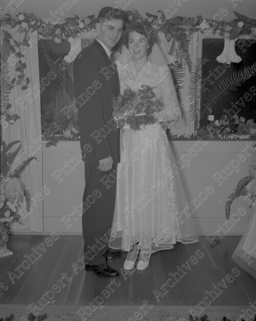 Scope & Content: Item consists of Vern Pyde and Marion Shenton standing together on their wedding day. Handwritten annotation on recto of copy 2 reads: "Miss Shenton. Mr. & Mrs. Nov. 19 - 1953." Stamped annotation on verso of copy 2 reads: "Photo by Jack Wrathall Prince Rupert, B. C."