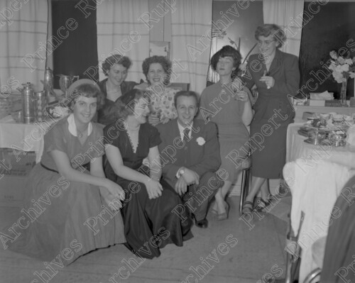 Scope & Content: Item consists of a group of six female guests and Norman Shenton at the wedding of Vern Pyde and Marion Shenton. Handwritten annotation on recto of copy 2 reads: "At Mr. & Mrs Wedding. Nov. 1953." Handwritten annotation on verso reads: "Miss Shenton. Photo by Jack Wrathall Prince Rupert, B. C."