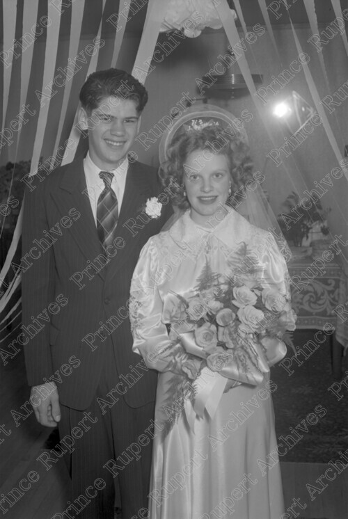 Scope & Content: Item consists of Mr. and Mrs. Breimo standing together on their wedding day. Handwritten annotation on recto of copy 2 reads: "Mr. & Mrs. July 12 - 1955." Handwritten annotation on verso of copy 2 reads: Breimo. Photo by Jack Wrathall Prince Rupert, B. C."