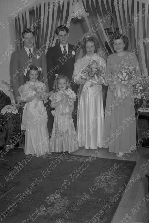 Scope & Content: Item consists of the bride and groom at the Breimo wedding standing in the middle of a man and a woman with two young girls in front. Handwritten annotation on recto of copy 2 reads: "Mr. & Mrs. July 12 - 1955." Handwritten annotation on verso of copy 2 reads: "Breimo. Photo by Jack Wrathall Prince Rupert, B. C."
