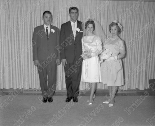 Scope & Content: Item consists of Mr. and Mrs. Steve Comadina standing in between a man and woman on their wedding day. Handwritten annotation on recto of copy 2 reads: "Mr. & Mrs. Steve Comadina. Wedding. July 6. 1963." Stamped annotation on verso of copy 2 reads: "Photo by Jack Wrathall Prince Rupert, B. C."