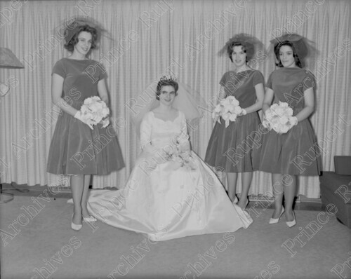 Scope & Content: Item consists of Marilyn Kerr (nee Anderson) crouching down on the ground with one bridesmaid to her left and two bridesmaids to her right on her wedding day on November 23, 1963. Handwritten annotation on recto of copy 2 reads; "Marily [sic] Anderson's Wedding. To A. Kerr. Nov. 23 1963." Stamped annotation on verso of copy 2 reads: "Photo by Jack Wrathall Prince Rupert, B. C."