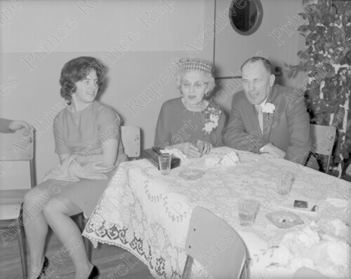 Scope & Content: Item consists of Marilyn Kerr (nee Anderson) sitting at a table with her parents-in-law Mrs. And Mr. Gordon Kerr on November 23, 1963. Handwritten annotation on recto of copy 2 reads: "At Marilyn's Wedding. Mrs. Marilyn Kerr & Father in Law. Mr. & Mrs. Gordon Kerr. Nov. 23. 1963." Stamped annotation on verso of copy 2 reads: "Photo by Jack Wrathall Prince Rupert, B. C."