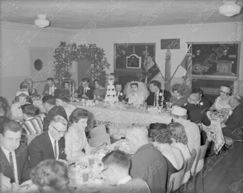 Scope & Content: Item consists of a view of guests at the head table and another table eating dinner at the wedding of Art and Marilyn Kerr (nee Anderson), November 23, 1963.