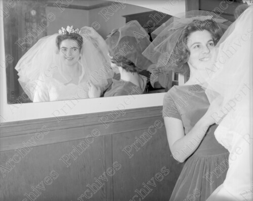 Scope & Content: Item consists of Marilyn Kerr (nee Anderson) looking at herself in a mirror as a bridesmaid helps her fix her veil, November 23, 1963.