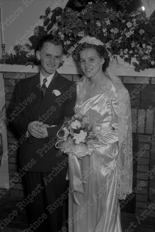 Scope & Content: Item consists of Jack and Dorothy Eastwood (nee McLeod) posing for a photograph in front of a fireplace on their wedding day. Handwritten annotation on verso of copy 2 reads: "Eastwood 19. Photo by Jack Wrathall Prince Rupert, B. C."
