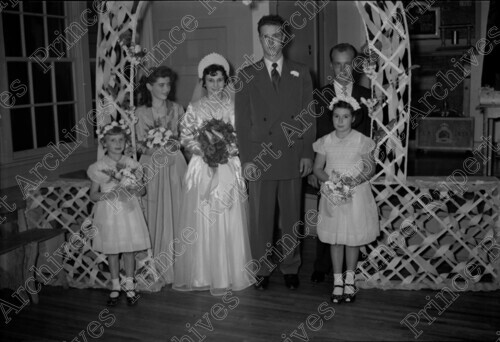 Scope & Content: Item consists of the wedding party of Mr. and Mrs. Ralph Wick. Pictured from left to right is: Wilma (Bunty) Barrie, Pat (Stuart) Prystay, Buddy (Barrie) Wick, Ralph Wick, John Wick and Sharon (Bury) Eyford. Handwritten annotation on recto of copy 2 reads: "Mr. & Mrs. Ralph Wick. Wedding. 19." Stamped annotation on verso of copy 2 reads: "Photo by Jack Wrathall Prince Rupert, B. C."