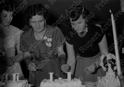 Scope & Content: Item consists of three women working on the cake at the wedding of Mr. and Mrs. Ralph Wick. Pictured from left to right is: Madeline Youngman, Cis Barrie and Jacqueline (Ratchford) Young. Handwritten annotation on recto of copy 2 reads: "At Mr. & Mrs. Ralph Wick. Wedding. 19." Stamped annotation on verso of copy 2 reads: "Photo by Jack Wrathall Prince Rupert, B. C."