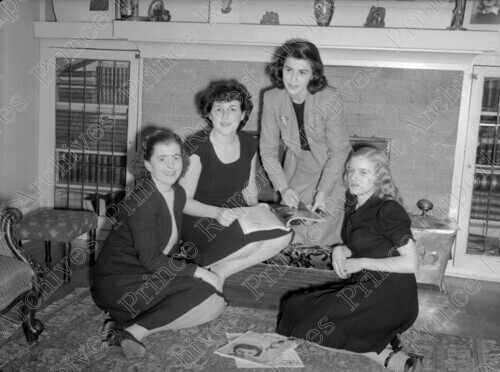 Scope & Content: Item consists of from left to right: Frances Moore, Charlotte Balagno, Dellie Balagno and Nora McCaffery looking through a magazine and sitting on a living room floor in front of a fireplace. Handwritten annotation on recto of copy 2 reads: "Dec. 1945. 1. Francis Moore. 2. Charlotte Balagno. 3. Dellie Balagno. 4. Nora McCaffery." Stamped annotation on verso of copy 2 reads: "Photo by Jack Wrathall Prince Rupert, B. C."