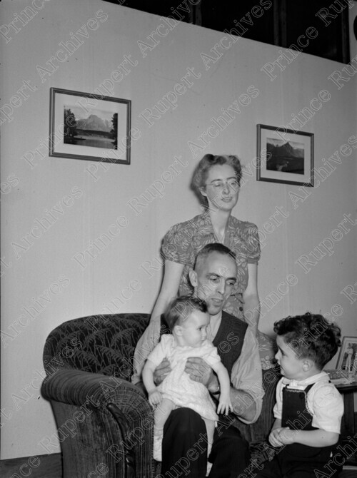 Scope & Content: Photograph depicts Mrs. Bartlett sitting behind her husband Bert on a couch. Bert Bartlett is holding a baby as a toddler aged child looks on. Handwritten annotation on recto of copy 2 reads: "Mr. & Mrs. Bert Bartlett & Family. 1946."