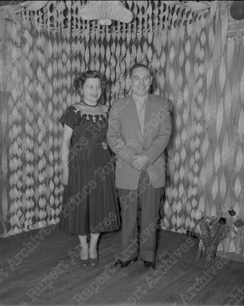 Scope & Content: Item consists of Jean and Bill Murdock standing together with linked arms showing streamers in the background. Handwritten annotation on recto of copy 2 reads: "Mr. & Mrs. Bill & Jean Murdock. June 1954." Stamped annotation on verso of copy 2 reads: "Photo by Jack Wrathall Prince Rupert, B. C."