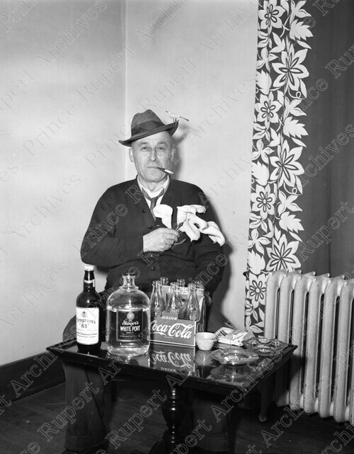 Scope & Content: Item consists of Charlie Balagno wearing a fedora, holding a bouquet of flowers and sitting at a table with Coca Cola, a bottle of white port, whiskey and ashtrays on it. Handwritten annotation on recto of copy 2 reads: "Charley Balagno. 1952." Stamped annotation on verso of copy 2 reads: "Photo by Jack Wrathall Prince Rupert, B. C."