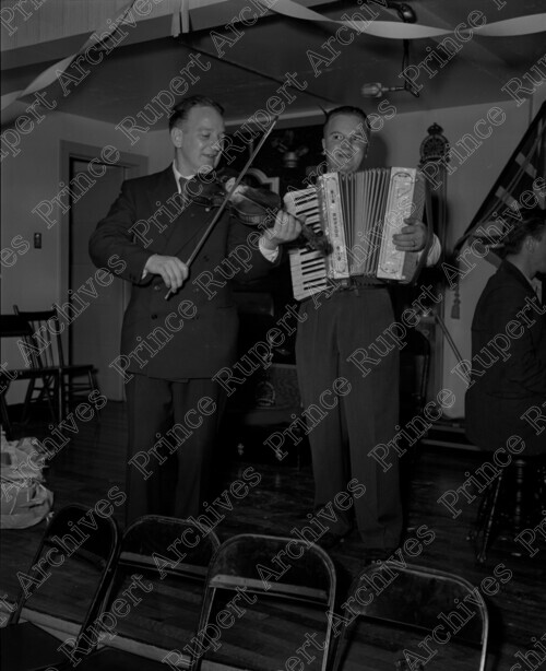 Scope & Content: Bert Cameron plays the violin with his brother Russell Cameron who is playing the accordion at an unknown location. Handwritten annotation on recto of copy 2 reads: "Bert Cameron & Brother Russel [sic] Cameron. Aug. 1951." Stamped annotation on verso of copy 2 reads: "Photo by Jack Wrathall Prince Rupert, B. C."