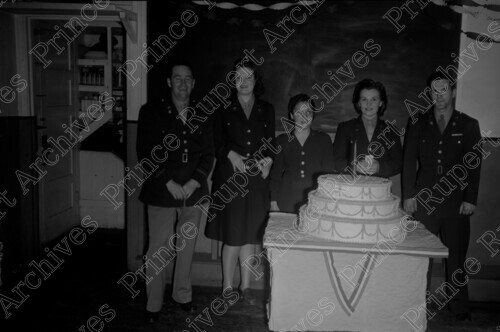 Scope & Content: Item consists of two men and three women all in army uniforms standing behind a very large cake with a candle in it at an U.S. Army party. Handwritten annotation on recto of copies 2 and 3 reads: "American Army Party. 1943. Pr. Rupert." Stamped annotation on verso of copies 2 and 3 reads: "Photo by Jack Wrathall Prince Rupert, B. C."