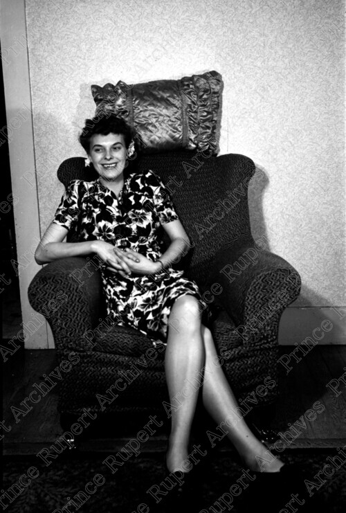 Scope & Content: Item consists of Aggie Fossum wife of Chris Fossum sitting in a armchair and wearing a floral print dress at a home in the 200 block of 8th Ave West. Handwritten annotation on recto of copy 2 reads: "Mrs (Aggie) Chris Fossum. 200 Blk. 8th Ave. W. 1941."