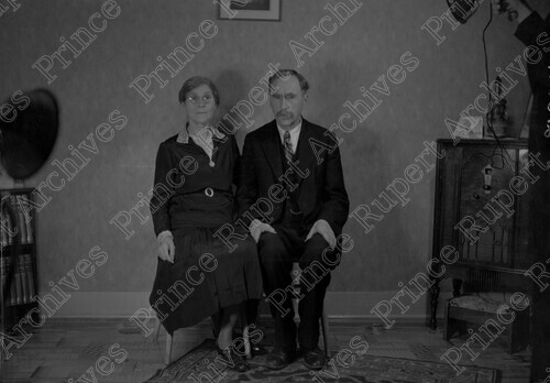 Scope & Content: Item consists of the mother and father of Frank Glass sitting next to each other at an unknown location. Handwritten annotation on recto of copy 2 reads: "Mr. & Mrs. Glass - Franks Father. 1936." Stamped annotation on verso of copy 2 reads: "Photo by Jack Wrathall Prince Rupert, B. C."
