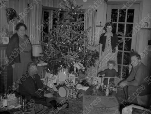 Scope & Content: Item consists of Mr. and Mrs. Oscar Guelpa along with another man and woman and a young child on a tricycle, all in a living room showing a Christmas Tree with presents underneath it. Handwritten annotation on recto of copy 2 reads: "Mr. & Mrs. Guelpa. Mr. & Mrs. Oscar Guelpa. 1944." Stamped annotation on verso of copy 2 reads: "Photo by Jack Wrathall Prince Rupert, B. C."