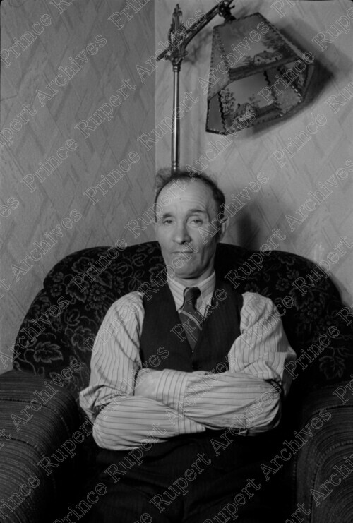 Scope & Content: Item consists of Verna Fossum's father, Pete Wikdal, posing for a photograph in an unknown location. Handwritten annotation on recto of copy 2 reads: "Verna Fossum's Father. 1944." Stamped annotation on verso of copy 2 reads: "Photo by Jack Wrathall Prince Rupert, B. C."