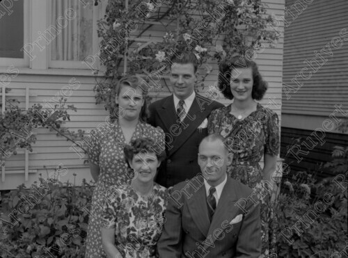 Scope & Content: Item consists of Mr. and Mrs. Harry Black crouching down in front with two women and a man standing behind them in a garden on 4th Avenue East. Handwritten annotation on recto of copy 2 reads: "Manager - Capitol Theatre. Mr. & Mrs. Harry Black & Family. 1945." Stamped annotation on verso of copy 2 reads: "Photo by Jack Wrathall Prince Rupert, B. C."
