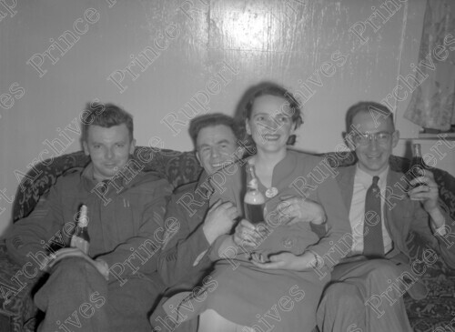 Scope & Content: Item consists of three men holding drinks and sitting on a couch while a woman sits on the lap of the man in the middle at a Sergeant's Party at Barrett Point. Handwritten annotation on recto of copy 2 reads: "Sgt.'s Party at Barrett Point. 1945." Stamped annotation on verso of copy 2 reads: "Photo by Jack Wrathall Prince Rupert, B. C."