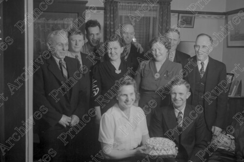 Scope & Content: Item consists of Mr. and Mrs. Herman Peterson sitting down with a cake in front of them on their anniversary. Seven men and two women stand behind them. Handwritten annotation on recto of copy 2 reads: "Mr. & Mrs Herman Peterson. Anneversary [sic]. Feb. 1945."