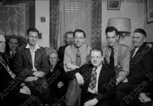 Scope & Content: Item consists of eight men sitting in the living room at Pete Peterson's home at the 100 block of 8th Ave East. Some people included are: Nels Jensen, A. Morse, Dan Wick, Jack Wrathall, Pete Peterson and Paddy Ivarson. Handwritten annotation on recto of copy 2 reads: "No - 1. 2. Nels Jenson. 3. A. O. Morse. 4. 5. Dan Wick. No - 6. Jack Wrathall. 7. Pete Peterson. 8. Paddy Ivarson. At Pete Peterson's House. 100 Blk. 8th. Ave. E. 1945." Stamped annotation on verso of copy 2 reads: "Photo by Jack Wrathall Prince Rupert, B. C."