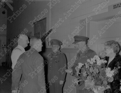 Scope & Content: Item consists of a woman holding a large bouquet of flowers looks on as two men in civilian clothing make a presentation to Colonel Syd D. Johnston and another man in a military uniform. Handwritten annotation on recto of copy 2 reads: "Presentation to Col. S. D. Johntom [sic]. 1945. Prince Rupert." Stamped annotation on verso of copy 2 reads: "Photo by Jack Wrathall Prince Rupert, B. C."