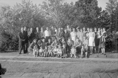 Scope & Content: Item consists of a large group of men, women and children from the Dickens extended family posing for a photograph at an unknown location. Pictured in the back row is: Percy Bond, Frank Gomez, Mary Gomez, Ted Morrow, Henry Dickens, Syd Dickens, Sonny Dickens, Young Sonny Dickens, Ted Dickens, Jack Bond, Min Dickens, Bill Rothwell, Elvina Alexander, Emmy Rothwell, May Bond, Edna Bond, Betty Gomez, Pearl (Pebbles) Dickens, June Dickens, Genevieve Dickens, Rose Morrow and Ross Morrow. Pictured in the second row is: Hilda Bond, Elvina and Evelyn Morrow, Ron Rothwell, Gordon Rothwell, John Bond, Sidney Alexander, Bill Rothwell and Evelyn Alexander. Pictured in the first row: an unknown girl, Sharon Bond, Sidney Bond, Red Dickens, Carol Dickens, John Gomez, Lorraine Dickens and Sid Dickens. Handwritten annotation on recto of copy 2 reads: "Mr. & Mrs. Dickens & Family. Jun. 13 - 1946." Stamped annotation on verso of copy 2 reads: "Photo by Jack Wrathall Prince Rupert, B. C."